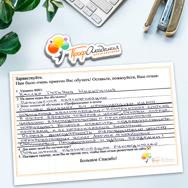 Спасибо большое за организацию курса повышения квалификации "Контрактная система в сфере закупок товаров и услуг", "Основы коррупционного законодательства и противодействия коррупции". Хочется отметить содержательность программ, и их практическое значение. Особая благодарность руководителю центра образовательных услуг Ларисе Михайловне Оленниковой. Процветания и удачи академии!