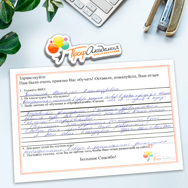 Огромное спасибо за отличный учебный материал и за учебный процесс. Обучаемся не в первый раз и остаемся по максимуму довольными всем. "Профакадемия" хорошая, самое главное, что учиться можно в удобное для себя время, не прерывая свою трудовую деятельность. Надеемся на дальнейшее сотрудничество.